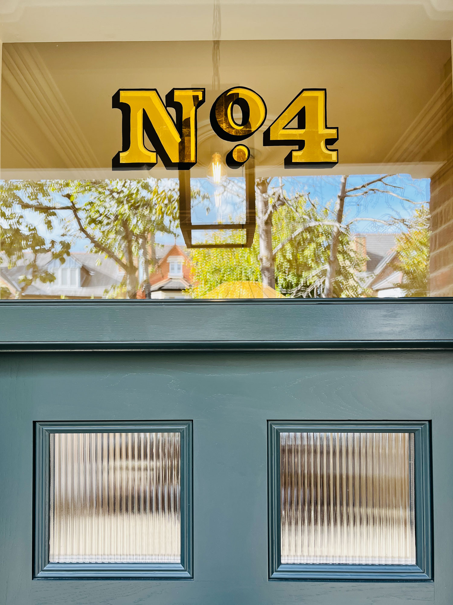 Designed using period appropriate numerals and lettering to compliment the achitectural style of a property and carefully hand painted and gilded with gold leaf onto glass using traditional methods.